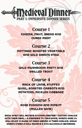 Each Guest will receive a complimentary custom chalice with their meal — a keepsake to take home as a memento of the evening. Guests ages 21 and over will enjoy a glass of Mead served in their chalice, while Guests under 21 will receive a non-alcoholic beverage served in theirs.